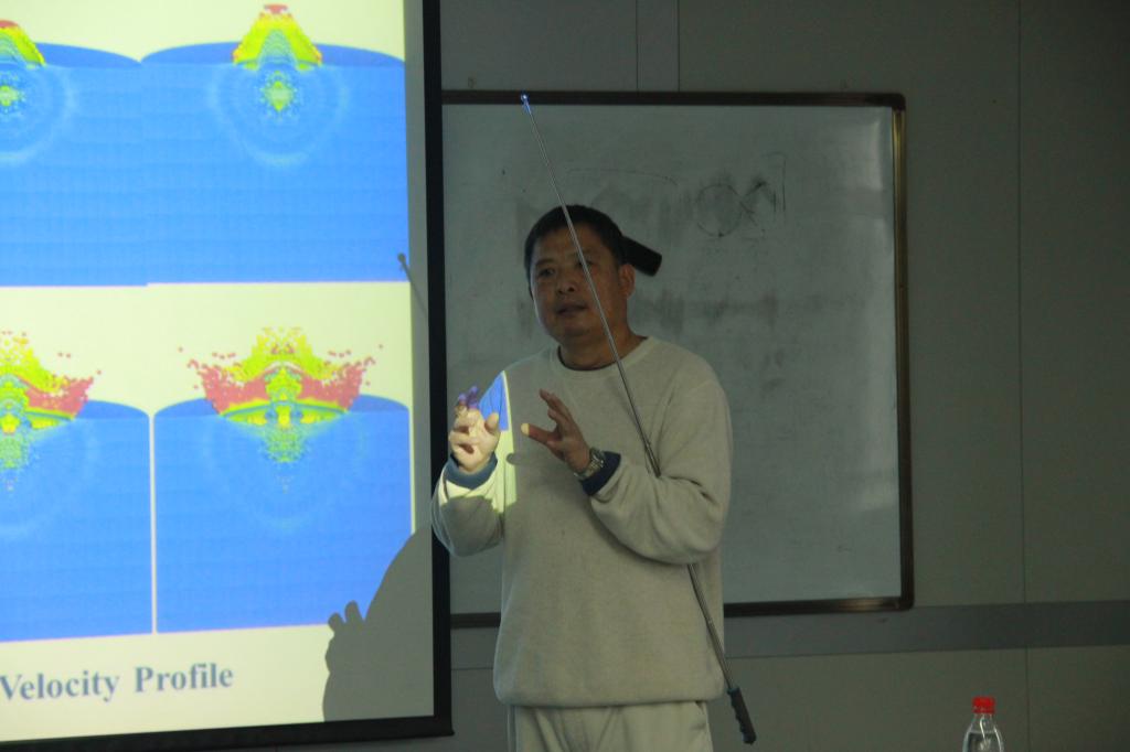 李教授首先向运载师生介绍了近场动力学(peridynamics, PD)这种新兴的计算力学分支。该方法基于非局部作用思想建立模型并通过求解空间积分方程描述物质力学行为,兼有分子动力学方法和无网格方法的优点,避免了基于连续性假设建模和求解空间微分方程的传统宏观方法在面临不连续问题时的奇异性,又突破了经典分子动力学方法在计算尺度上的局限,在宏/微观不连续力学问题分析中均表现出很高的求解精度和效率。之后,李教授向大家介绍了其课题组近期利用近场动力学方法数值模拟计算固体及颗粒材料中断裂、破碎等力学行为的最新进展,其算法的高效性和模拟的精确性给运载师生留下了深刻的印象。特别是李教授对土壤中复杂的爆炸力学行为的模拟,与实验数据高度匹配,引起广大师生的热烈讨论,受到李锡夔教授、郭旭教授的高度评价。